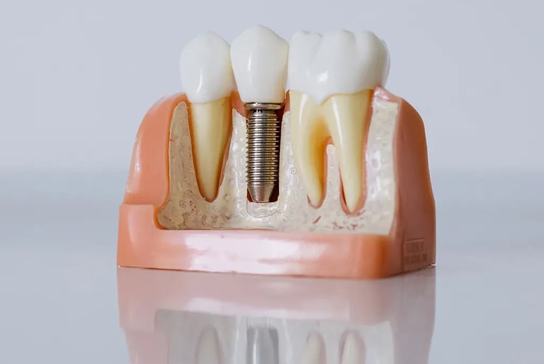 Implante Dentário: é um pino de titânio que substitui a raiz do dente perdido.